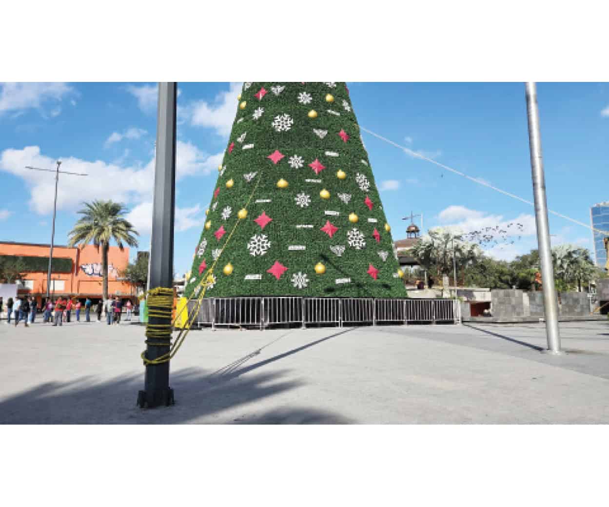 Son cuatro cuerdas las que sostienen la gigante estructura del pino navideño instalado por personal de servicios públicos primarios y que debido a la falta de precaución tuvieron que recurrir a esta rústica medida para asegurar que no colapse, toda vez que según trabajadores municipales, comenzó a tambalearse en horas de la mañana.